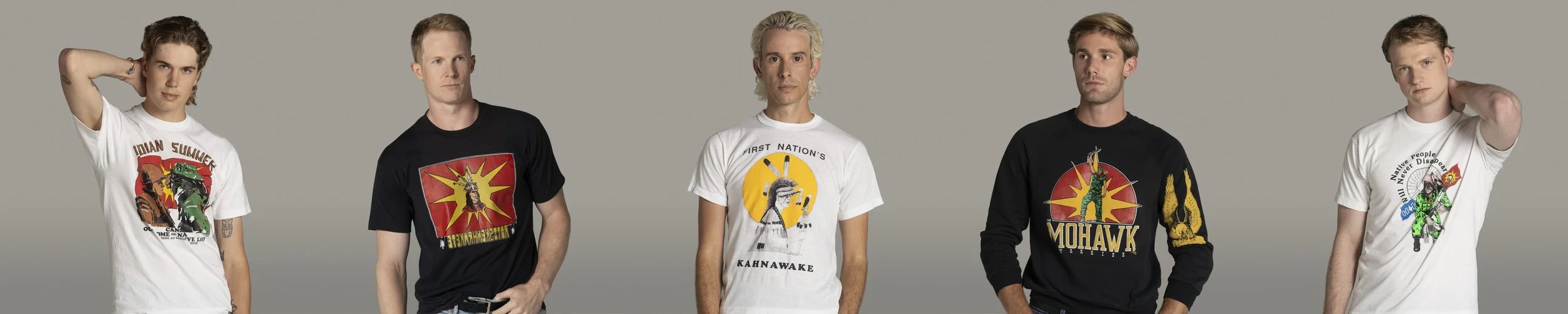 Rick Erickson gifted me a collection of 8 t-shirts that he bought while visiting the Peace Camp in Oka, (September 1990) and the Sacred Run (October 1991). He travelled there with Vancouver artist and close friend Paul Wong and they took pictures which they still have today. Mohawk vendors were selling their wares, some with images of the classic Mohawk warriors silhouetted on the Mohawk flag, others with actual images from the resistance. On the one-year anniversary of the Kanesatake Resistance (Oka Crisis) there was a Sacred Run across Canada with indigenous runners and friends going to indigenous communities along the way, to check in to make sure people were ok, with the run ending in Kahnawake Mohawk Territory. When the runner was close to Kahnawake, Rick ran the last few KMs and also bought more t-shirts at this gathering.